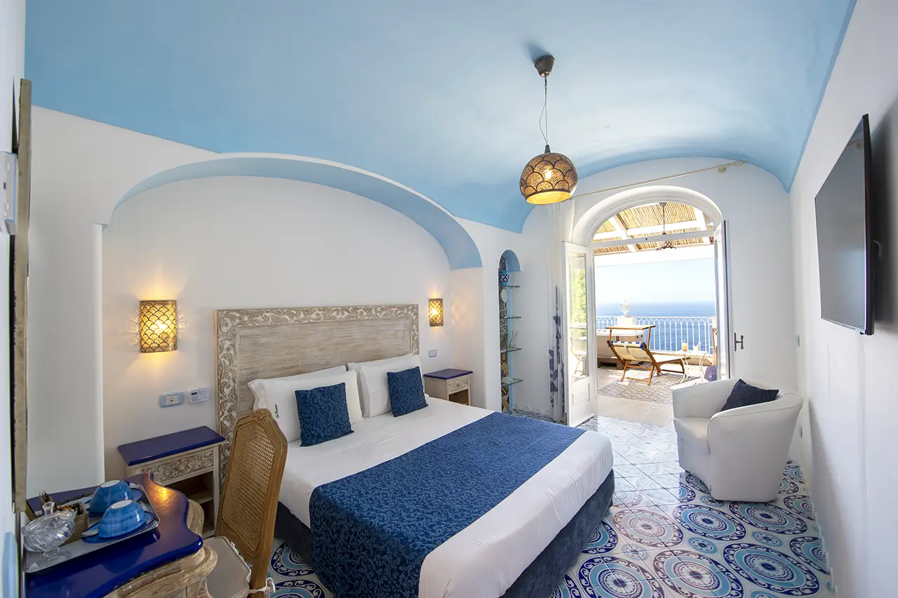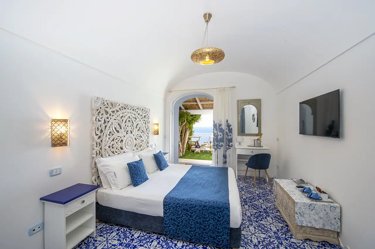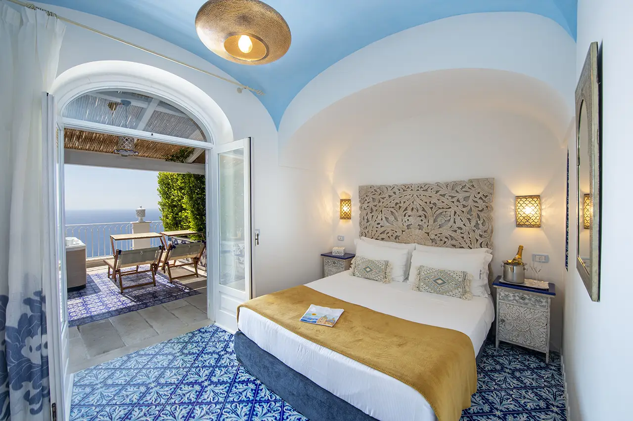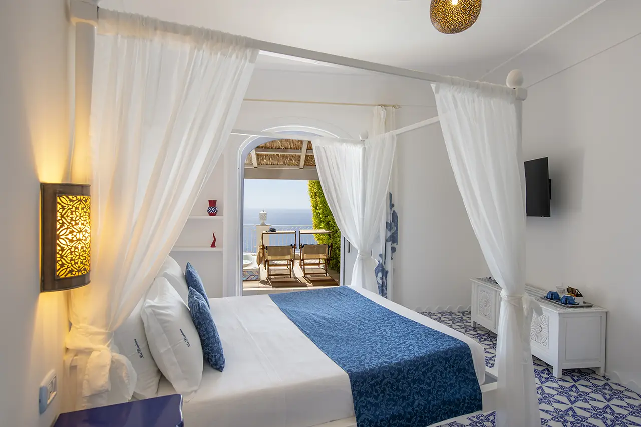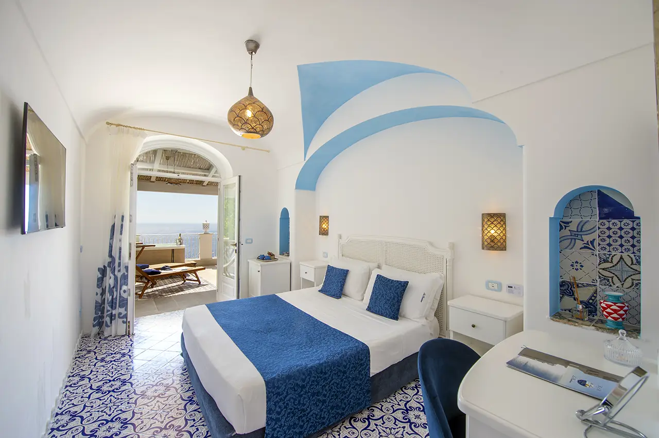 Ogni camera si apre sul proprio terrazzo panoramico, dove il Mediterraneo diventa lo scenario di ogni momento. Bagno privato, climatizzazione e design esclusivo. Maioliche artigianali di Vietri che brillano di tradizione, arredi di pregio scelti con cura, comfort contemporaneo che abbraccia. Ogni dettaglio è pensato per regalare un’esperienza unica.