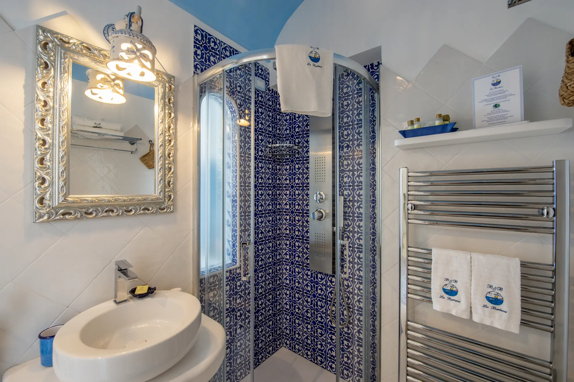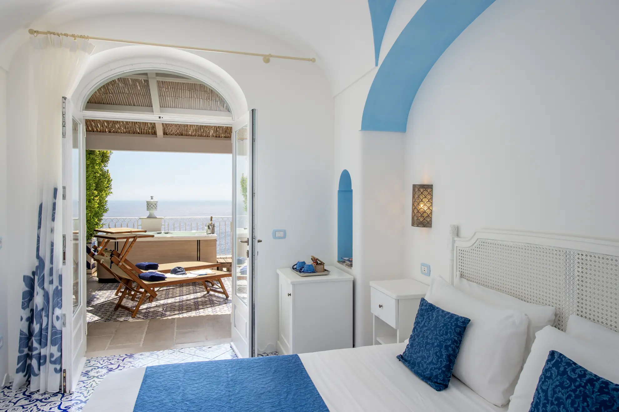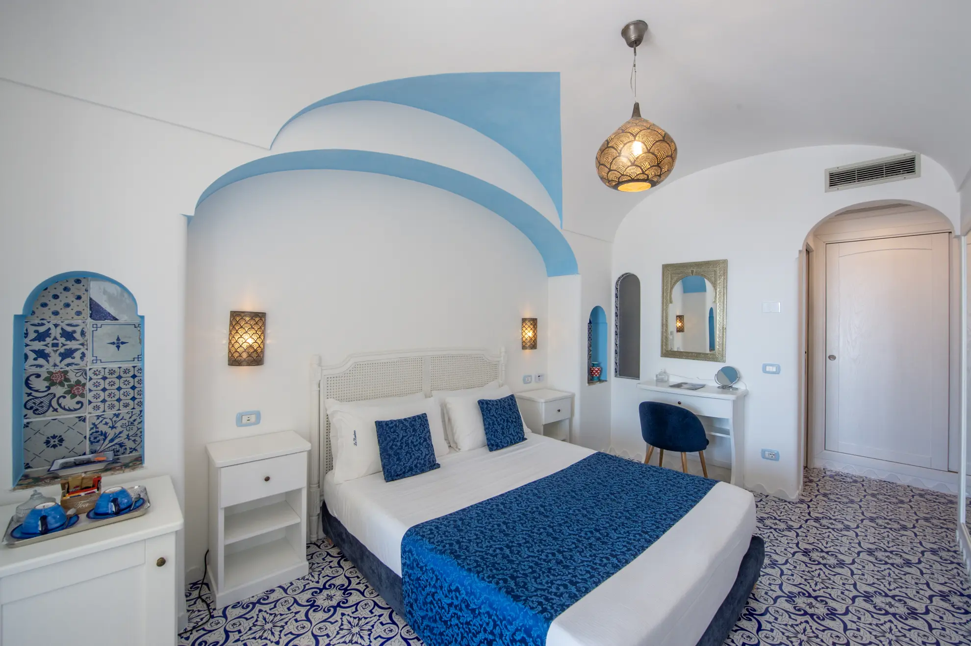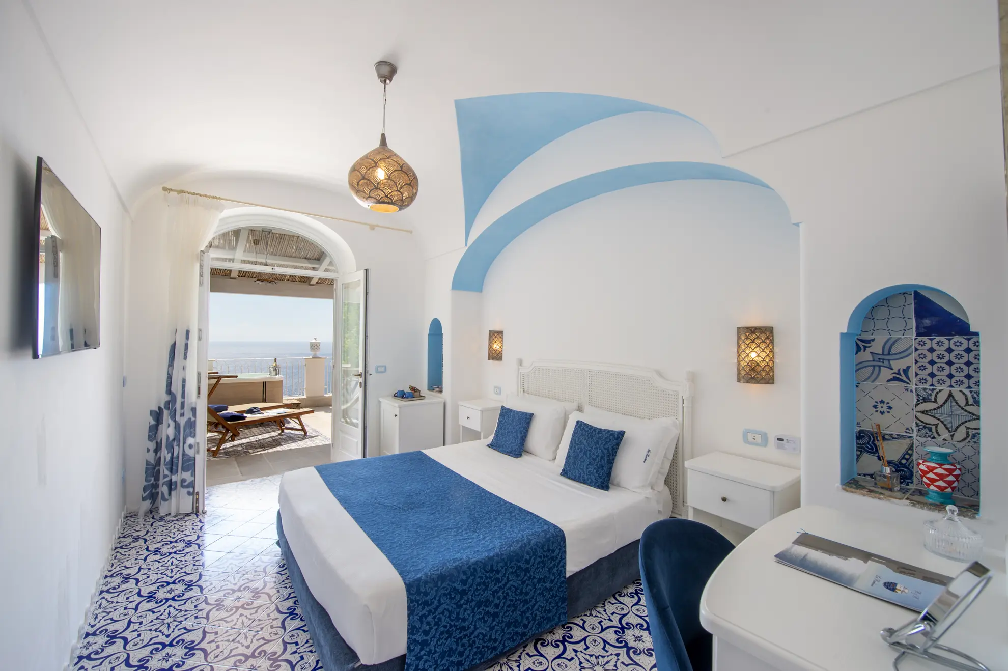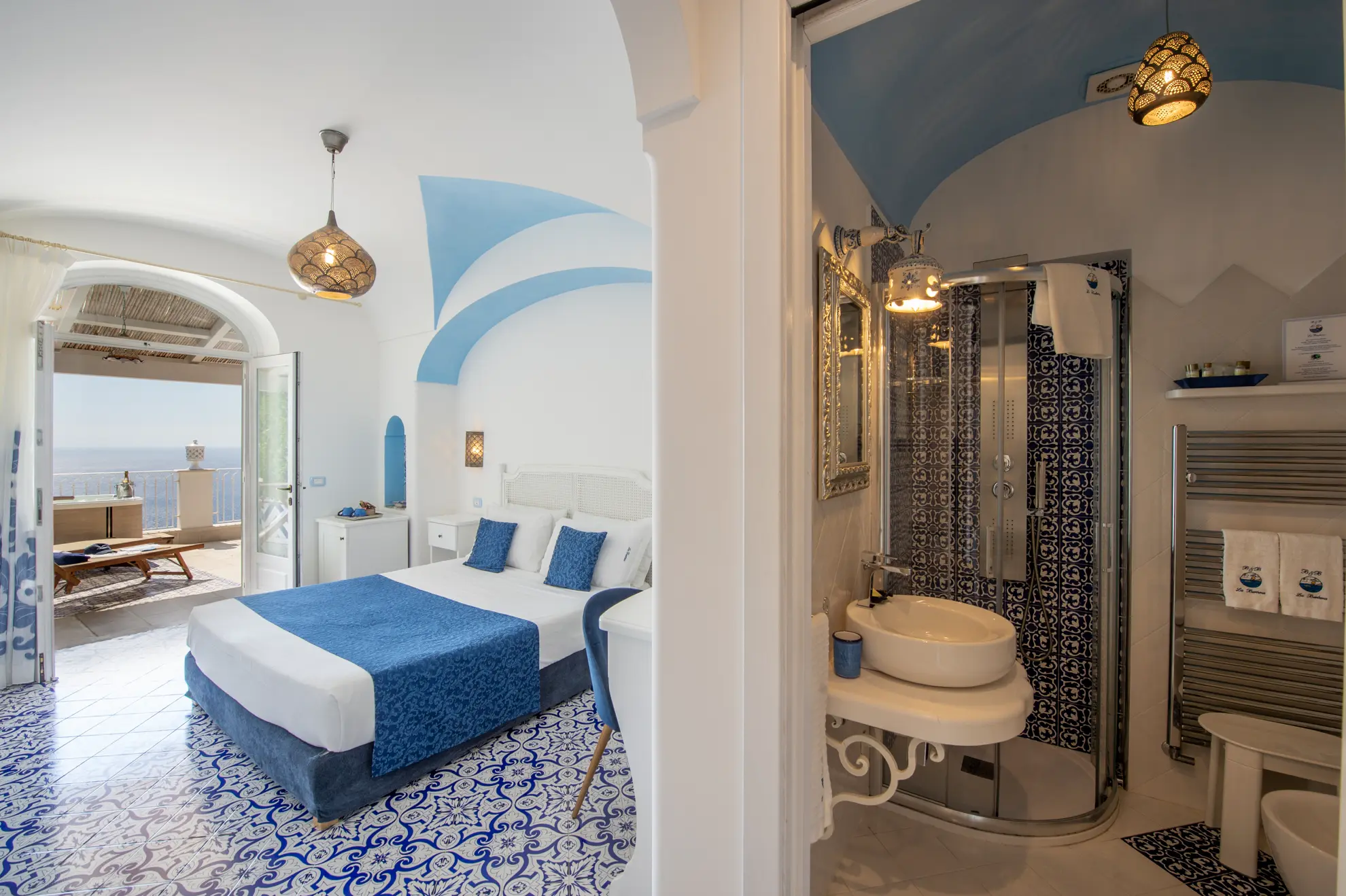 La camera, arredata con eleganza e cura per i dettagli, è raggiungibile con l’ascensore ed è situata nel primo livello della struttura. Gli arredi e le maioliche tipiche di Vietri sul Mare, di fattura artigianale ma dal design moderno, donano luminosità e un’intima atmosfera. I colori del mare di Praiano, su cui si affaccia il terrazzo privato e attrezzato, sono riportati nelle tonalità romantiche delle pareti e degli elementi che caratterizzano la camera e il bagno privato.