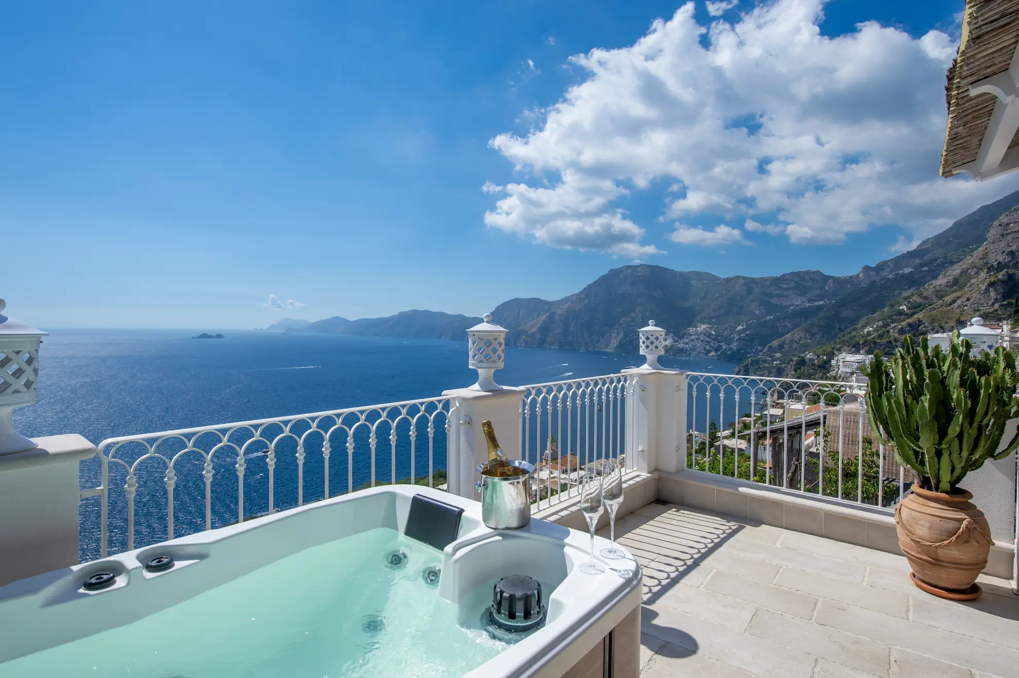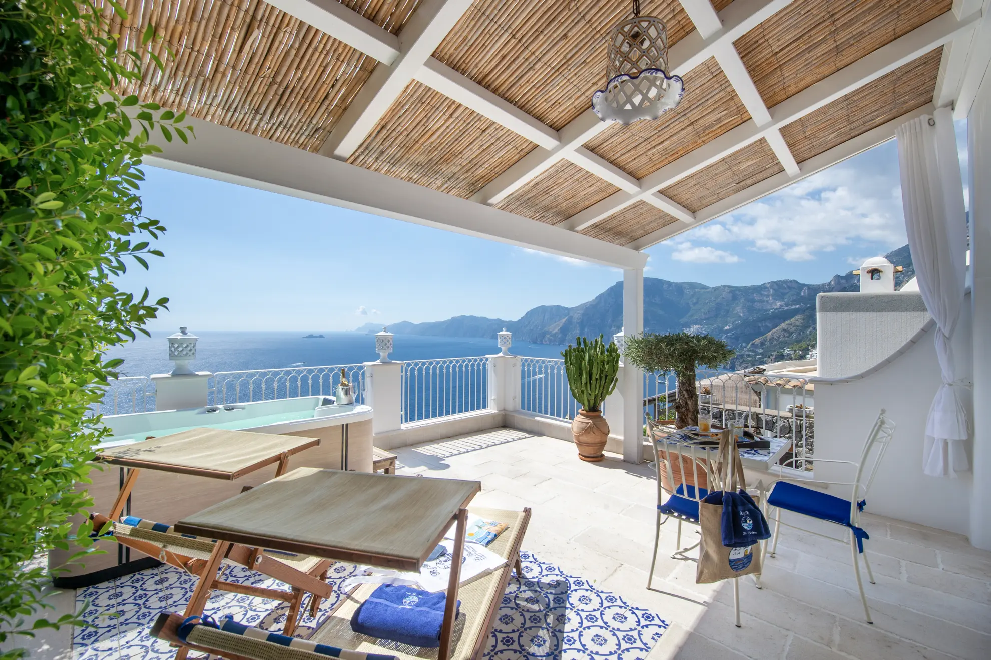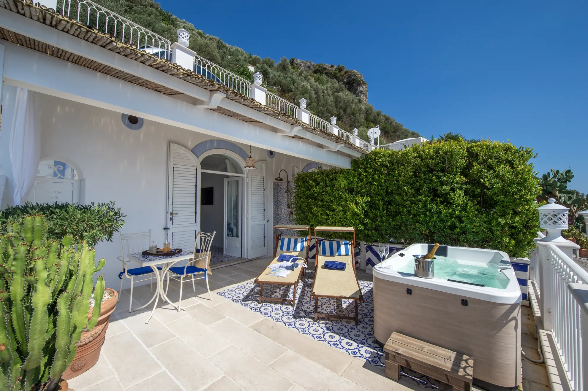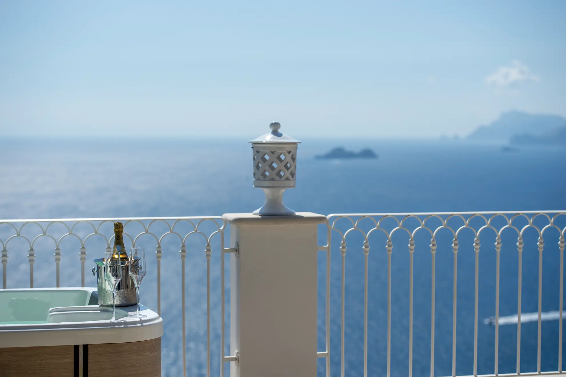 La camera, di 18 mq, è matrimoniale, ha accesso indipendente, pareti e porte insonorizzate, ambienti climatizzati, riscaldamento autonomo estate-inverno, Usb, Wi-Fi gratis, Tv Lcd, frigobar, cassaforte, elementi di arredo di design, scrittoio con sedia, armadio, comodini, materasso misura queen size, poltroncina, eleganti applique e lampadari, arredi in materiale naturale, bagno privato in camera, balcone con vetrate termiche, terrazzo con tavolino, sedie, lettini, doccia esterna, con una straordinaria vista sul mare, Capri, Positano, la Costiera Amalfitana.